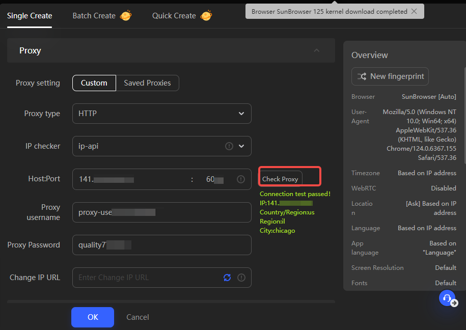 2. Scroll down to find the proxy configuration column, select "Custom", fill in the generated link in the "host: port" format, and then fill in the proxy account and password in turn.